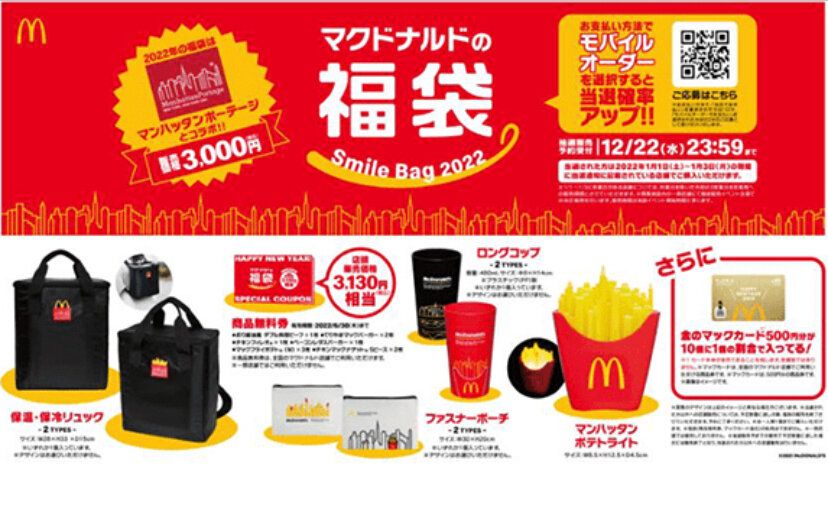 2022年のマクドナルドの福袋はマンハッタンポーテージとのコラボレーション福袋でした。福袋の中身は、マクドナルドとManhattan Portageのロゴがコラボレーションし、デザインされた「保温・保冷リュック」「ファスナーポーチ」「ロングコップ」のオリジナルグッズのほか、お馴染みのマクドナルドのポテトとマンハッタンの美しい街並みが融合した「マンハッタンポテトライト」、「マクドナルド商品無料券(税込3,130円相当)」。さらに福袋10個に1個の割合で、特別デザインの「金のマックカード500円分」も入っていました。
