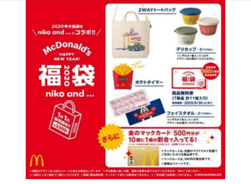 2020年のマクドナルドの福袋はniko and … とのコラボレーション福袋でした。福袋の中身は、マクドナルド創成期のロゴマークや初代マスコットキャラクター“SPEEDEE(スピーディー)”、niko and …のロゴマークなどがデザインされた「2WAYトートバッグ」「フェイスタオル」「デリカップ」のオリジナルグッズ、“ティロリ♪ティロリ♪”というマクドナルドお馴染みのメロディが鳴る「ポテトタイマー」、「マクドナルド商品無料券(税込3,270円相当)」。さらに、福袋10個に1個の割合で、特別デザインの「金のマックカード500円分」が入っていました。