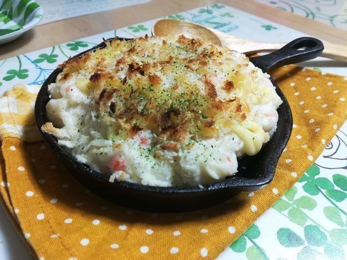 スキレットかグラタン皿にポテトサラダを山盛りにして、そこにマヨネーズ、パン粉かけて…グリルかオーブントースターでこんがり焼くと…。