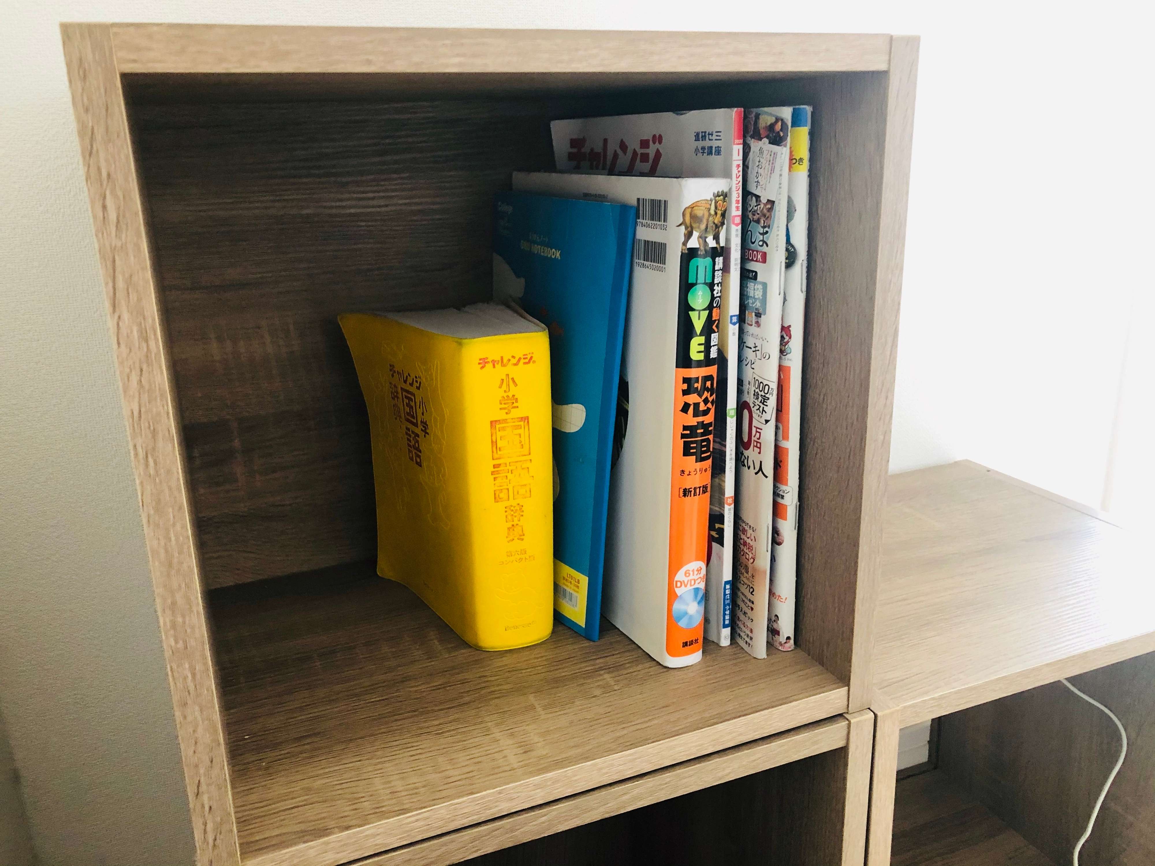 この商品は、固定ピンつきの1段収納ですが、最大3段まで重ねることが可能。サイズは幅340×奥行290×高さ340mmと、本を入れるのにもちょうどいいサイズです。雑誌・通信講座テキスト、図鑑、ノート、辞書などゆったり入りますよ。