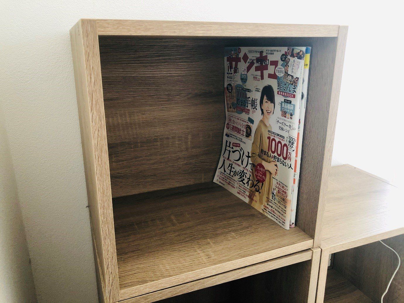 雑誌も入るサイズですので、小学生のランドセルに入る教科書やノート類は楽々入ります。色はブラウン、ホワイト、そして今回使用のナチュラルエルムの3色あります。