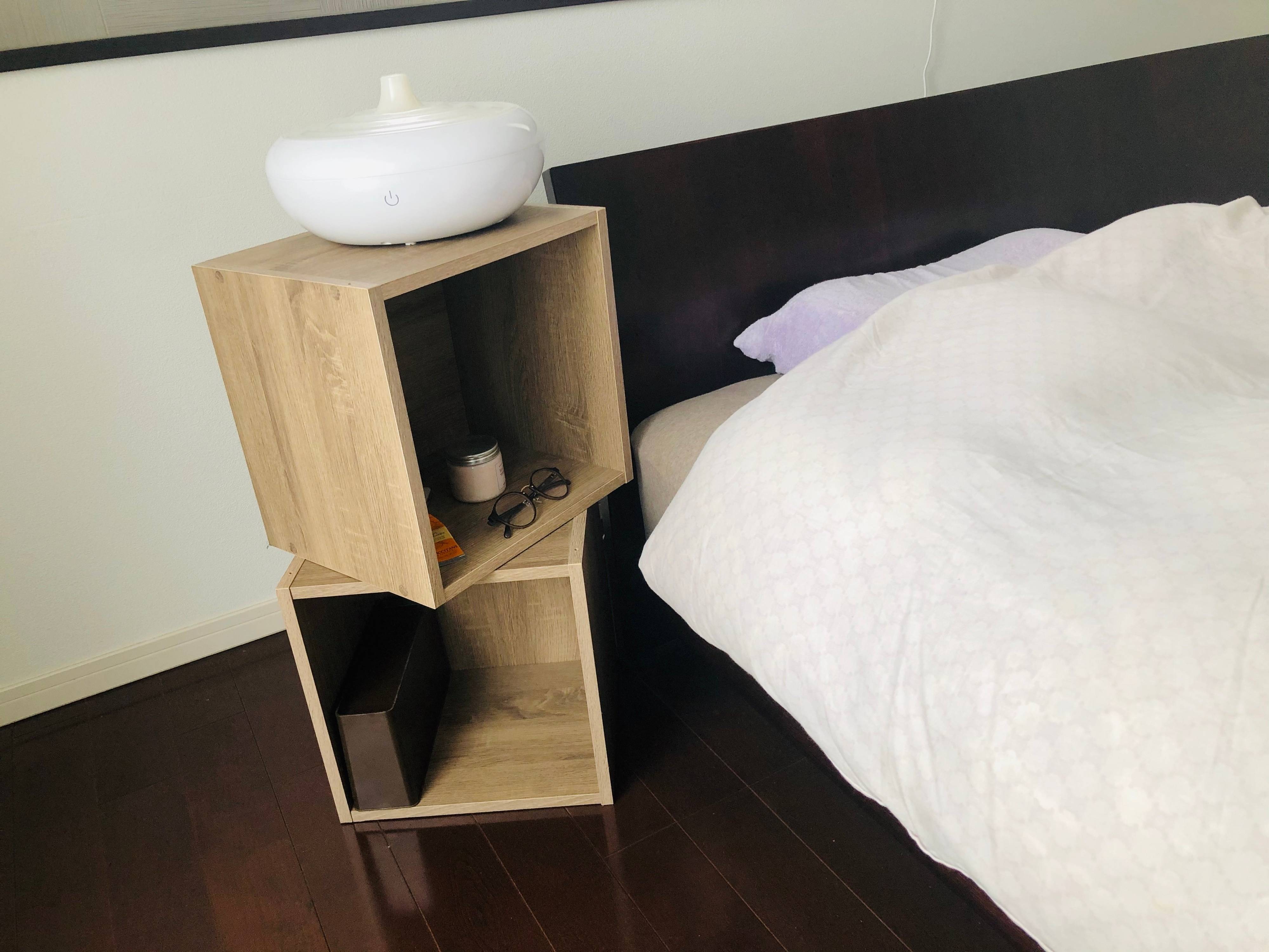 本や眼鏡、携帯などベッドまわりに置きたいものってたくさんありますよね。そんなときに、このシングルボックスを用意しておけば、寝る前の読み聞かせ用の本を置いたり、ケアグッズを置いたり、携帯などを置いたり……1ヵ所にまとめておくことができます。