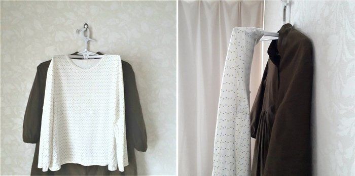 脇の下とフードが乾くだけで嬉しいのに、まだこれだけではないんです!なんとこのハンガーは2枚干しも可能。ワンピースとカットソーをまとめて干してみました。服が重ならずに干せるので、生乾きの心配はなさそうです。
