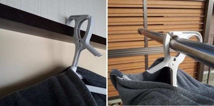 物干し竿を掴むことはもちろん、ドアの上の出っ張りに引っかけやすいデザインなんです。室内でのちょっとした一時干しにも対応できます。
