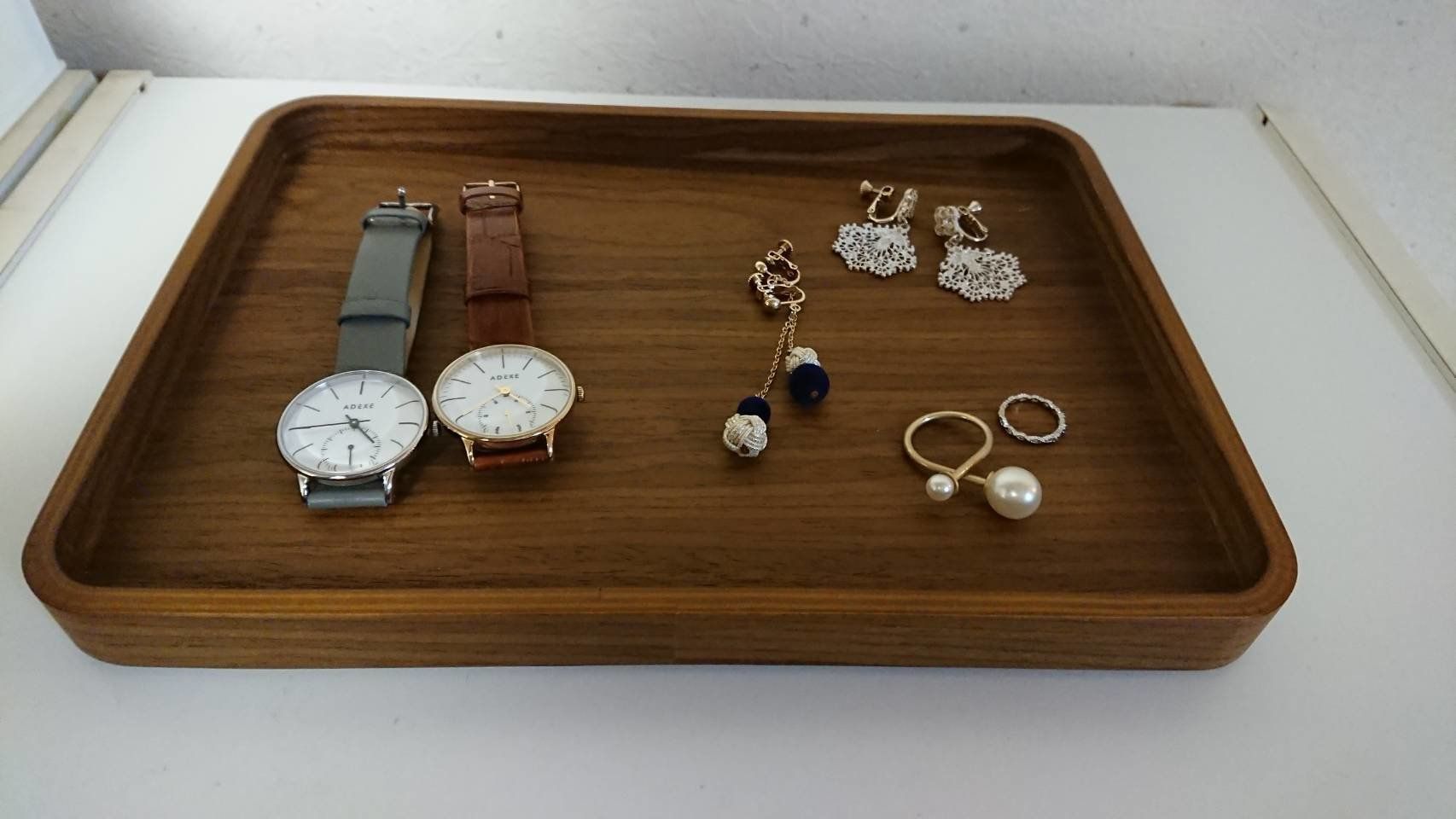 木目調のデザインなので、暮らしのさまざまなシーンでオシャレな演出をしてくれること間違いなし。たとえば、ついつい散らかりがちなジュエリーや腕時計など、小物置きスペースとして使ってみるのはいかがでしょう。「見せる収納」として気分も上がりますね。