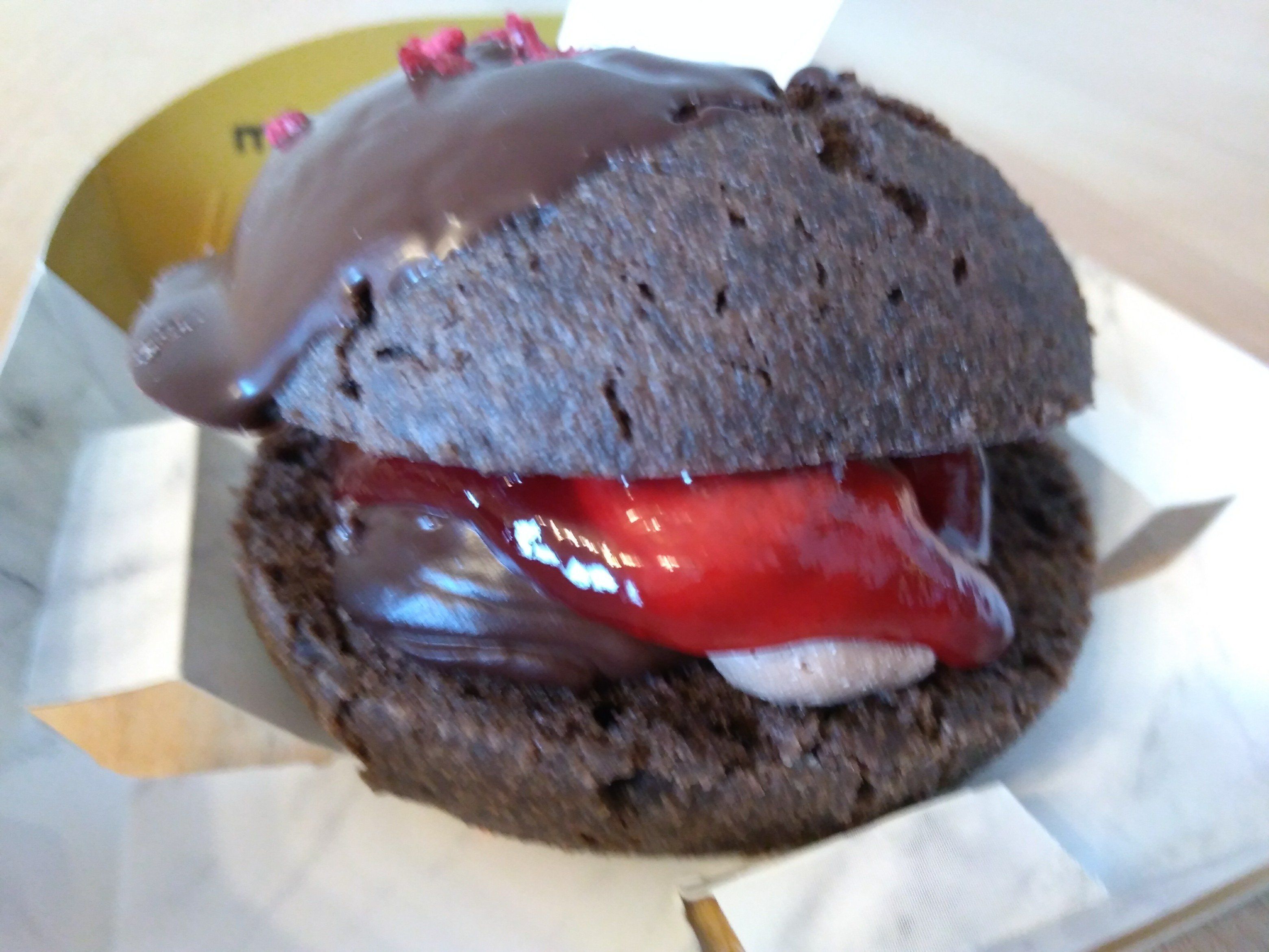 ガナッシュクリーム、ガナッシュホイップ、フランボワーズジャムをサンドし、チョコとフランボワーズ顆粒がトッピング。