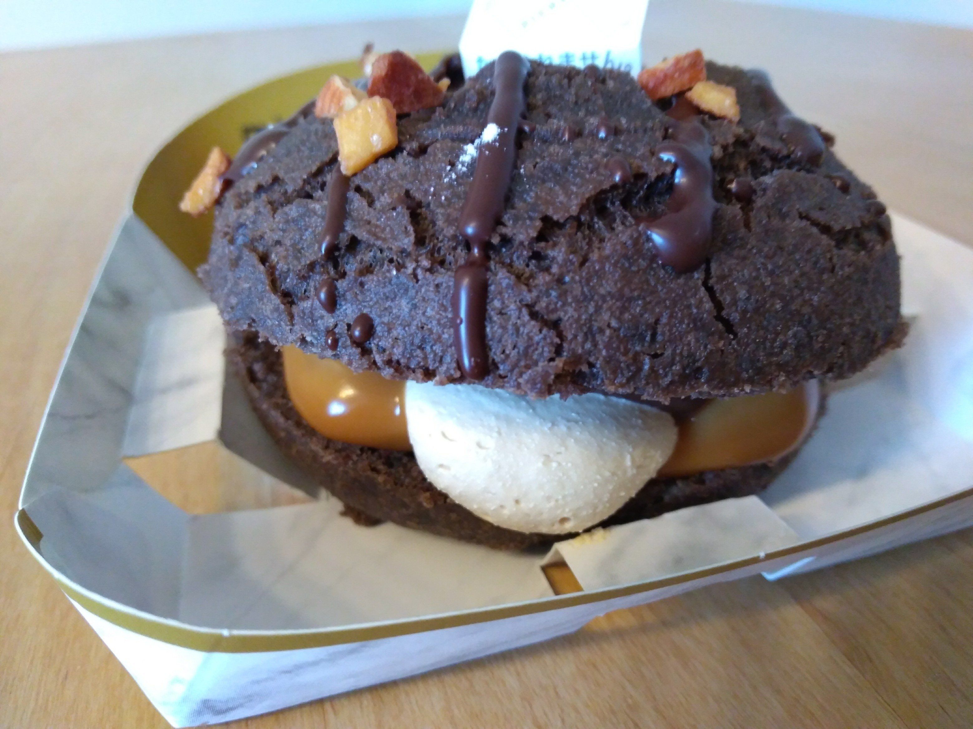 塩キャラメルクリームと塩キャラメルホイップ、ガナッシュクリームをサンドし、チョコとキャンディングアーモンドをトッピング。