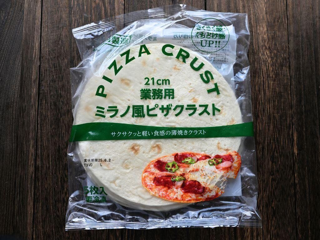次は、本格的なピザを自宅で楽しめる「ミラノ風ピザクラスト」。トッピングを自分好みにのせて焼くだけで完成するのでパパっとランチを作りたいときにも便利です。筆者は子どもたちが大好きなマヨコーンピザやソーセージをのせたピザを気分に合わせて調理しています。