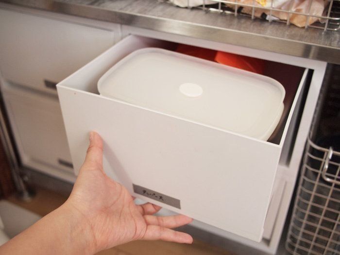 無印良品の収納グッズ、定番中の定番である「ポリプロピレンケース」。半透明のものを使っているかたは多いかもしれませんが、藤田さんがおすすめするのはホワイトグレータイプのもの。台所などでは使うものの中身がわかると混乱せずにすみ、お夕飯の支度などが手早く済みます。ホワイトグレーだと中が透過されていないので一瞬混乱してしまいそうですが、きちんとラベリングしておけば、カオス状態も回避できます。