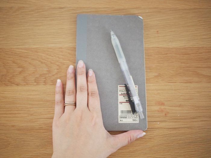 無印良品の「上質紙スリムノート・横罫縦ドットB6スリム・ライトグレー」は、B6サイズというのが絶妙で、どんな小さなカバンにもスルリと入ってしまって、打ち合わせに行く際にも荷物が小さくまとまります。40枚ほどのノートなので、薄さもバッチリ。かさばりません。長財布にちょっとだけ縦幅を持たせたくらいのサイズといったらわかりやすいかもしれません。とても小さいけれど決して使いにくくないので、おすすめです。