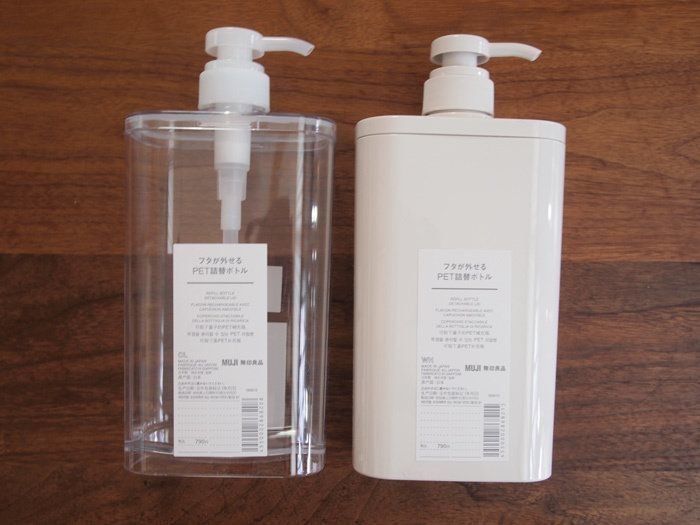 「フタが外せるPET詰替ボトル」はシャンプーなどの詰め替えが、そのまま入れらられるボトル。無印良品で販売しているシャンプー・コンディショナーに合わせたつくりですが、市販の詰め替え用も少し工夫すれば使うことができます。
