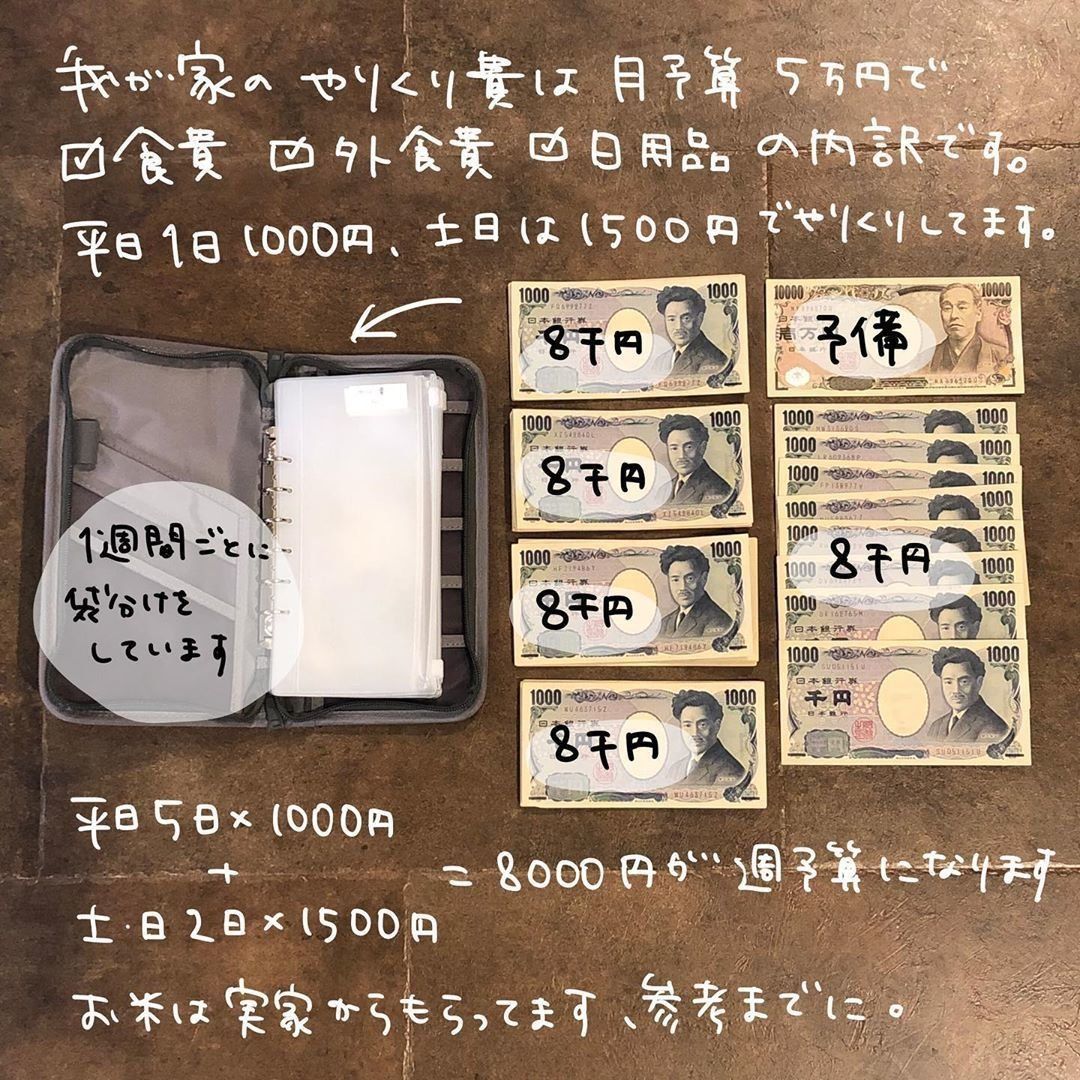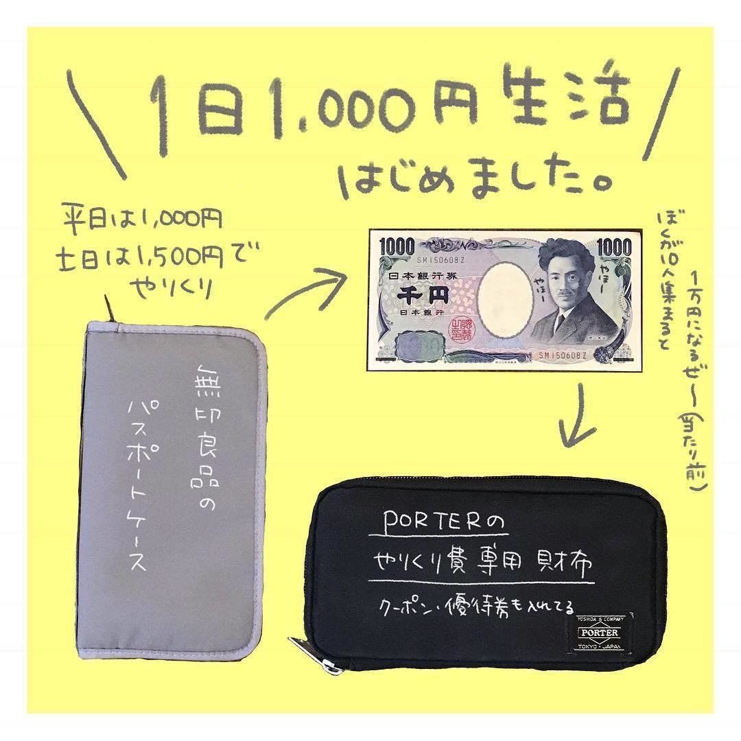 「家計管理は難しい」と感じる方におすすめ!項目分けもなく、シンプルな1日1,000円という予算を決める方法です。あらかじめ無印のパスケースに予算分けをしておくと分かりやすいです。
