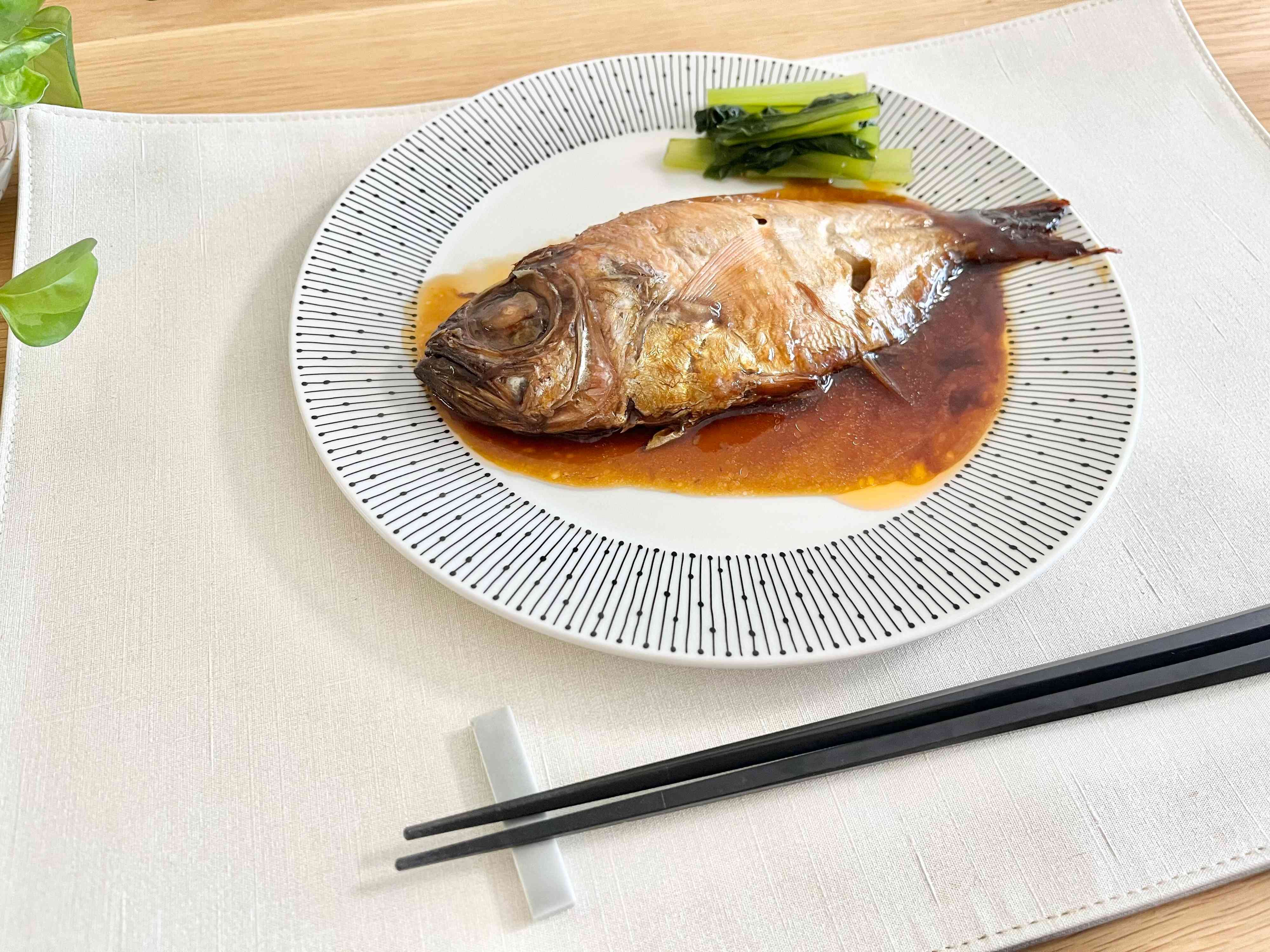 実際に、電子レンジで温めてみました。彩りにお野菜を少し添えたら、見た目はもう100点満点ですよね?金目鯛は約20cm以上もあって、身も肉厚で凄く立派です!