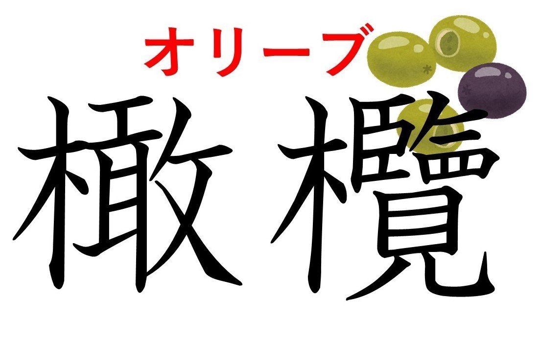 「きへん」の右側に「敢」と書く「橄」と、「きへん」の右側に「覧」のような字がある「欖」を並べて「橄欖」。