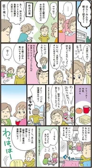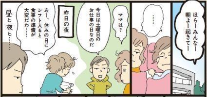 土日のシフトが入る場合、夫が休みなら、必然的に夫と子どもだけで1日を過ごすことになります。今の日本では、どうしても「親子関係」=「母子関係」になってしまい、夫がはじき出されがち。子どもが成人してからも父親との関係がうまくいかないこともよくあるそうです。幼いときにいかに父親と子どもの時間を持つかがその後のコミュニケーションにおいても大事とのこと。夫と子どものためにも、土日シフトを前向きにとらえる考え方もありだと思います。