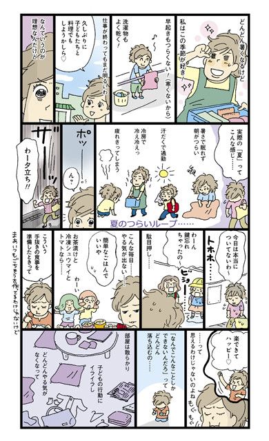 夏場は、暑さや冷房による温度差や熱帯夜の睡眠不足で体調をくずしがちな季節。かといって、仕事や家事が減るわけではありません。子育て中の場合、ついつい家族を優先にして、自分のことは後回しにしがち。でも、万一倒れてしまったら、家のことも仕事のこともかえって大変なことになりませんか。自分の気持ちや体調を本当にわかるのは自分だけ。過ごしにくい季節だからこそ、自分を大事にしましょう。