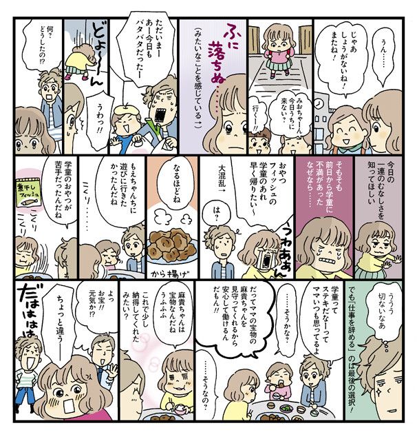 「学童保育」は、小学校低学年の子どもがいる共働き家庭の強い味方。ただし、学校や保育園と違って、「行かないお友達」がいます。麻貴ちゃんのように、学童に行かないお友達から家に誘われたり、公園に誘われたりしても、応じられません。また、嫌いなおやつが出た、学童内でけんかをしたなどの理由で「学童に行きたくない」と言いだすこともあるかもしれません。まずは子どもの話を聞いてあげましょう。