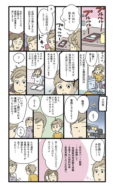 「薬局の事務・正社員募集」という求人を見つけてさっそく応募した美久。面接では緊張しながらも、夏休みの子どもたちの預け先や医療事務の資格について話す。「できれば経験者を採用したい」と言われてがっかりする美久。だが、担当者は面接後に美久がほかの応募者の子どもをあやす姿に気づく。担当者は、「経験者ではないから不採用」と思いつつ、迷った末、採用を保留にする