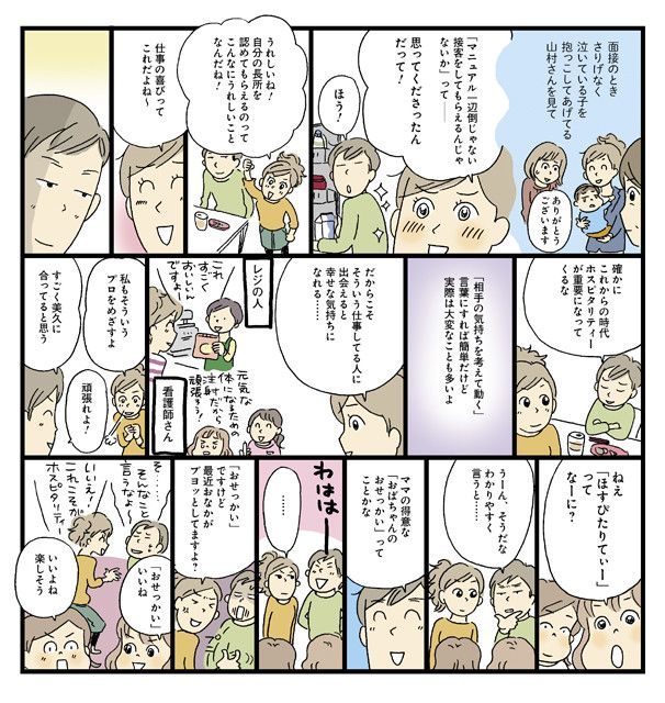 機械化、ロボット技術が進み、この先は多くの仕事が機械に取って代わられるともいわれています。そんなときだからこそ、昨今、マニュアル一辺倒ではない、気づかいや気くばりが求められています。「主婦業」を通して、いろいろな立場や年齢層との「コミュニケーション力」や「共感力」がつき、気づかいや気くばりができるようになっているはず。自信を持って、社会に還元していきましょう。