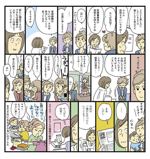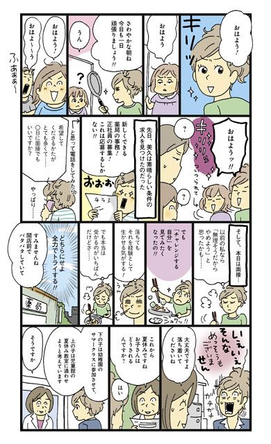 久しぶりに高校時代の友人・幸子と会った美久は、人事部にいる幸子に再就職活動について相談する。幸子から「資格さえあれば採用してもらえると思っている人が多い」と言われ、「自分には資格以外に強みがない」とがっかりする美久。しかし、幸子は、そんな美久を「家族のスケジュール管理や家事と育児のマルチタスクをこなすなど、主婦業をしているからこその強みがあるはず」と励ます。マイナス要因だと思っていた〝主婦業〞が強みにできるとわかり、勇気を出して求人への応募を始める美久だった