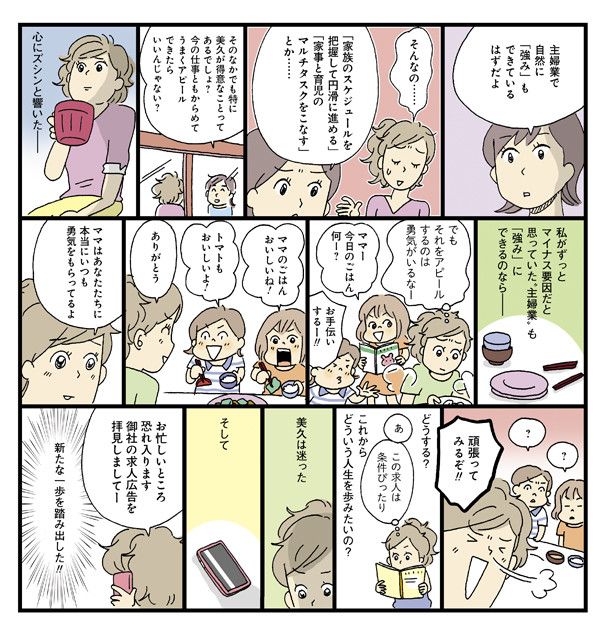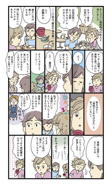 資格を取ったとはいえ、美久は相変わらず正社員の仕事は見つけられない。最近パートを始めたという幼稚園のママ友にその話をしたところ、後日ママ友から「資格を持っている人を知り合いの会社で募集している」という情報が! しかし、「正社員ではなくパート」「時給もそれほど高くない」ということで、応募するかどうか迷ってしまう。そのうちに「ほかの人に決まってしまった」と聞き、「悩んでいる時間がもったいなかった。『自分がどうしたいのか』しっかり気持ちを決めておかなければ」と反省する美久だった