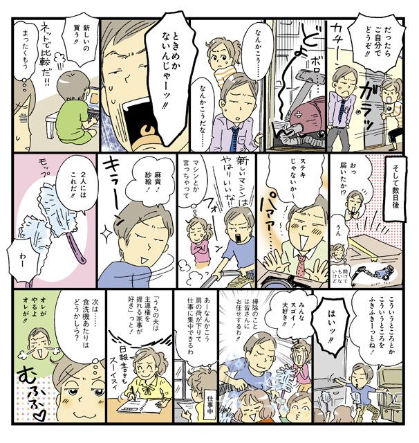 「掃除に消極的だった夫が、新しい掃除機の購入で積極的に」というのはよく聞く話。「機械」や「実験」を好きな男性が多いので、掃除機が古くなっていたら新しいものを夫に選んでもらい、料理や掃除の実験的な要素もアピールしてみてはいかがでしょうか? 子どもには、「○○ちゃんは××係ね」と役割を与えるのも有効。家族に達成感を与える褒め言葉を言うのも忘れずに。