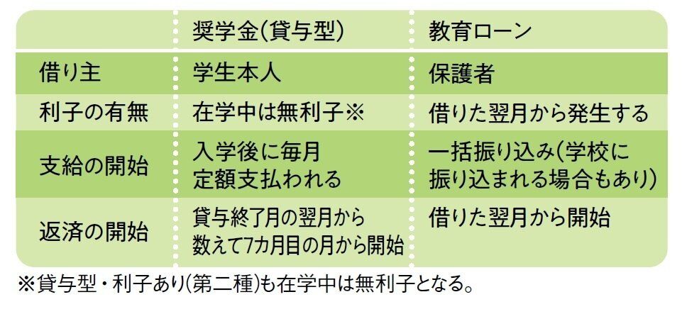 奨学金は子ども、教育ローンは親が借り主となり、利率は奨学金(貸与型・利子あり)のほうが低いのが特徴。支給や返済の時期、方法にも違いがあるので注意。