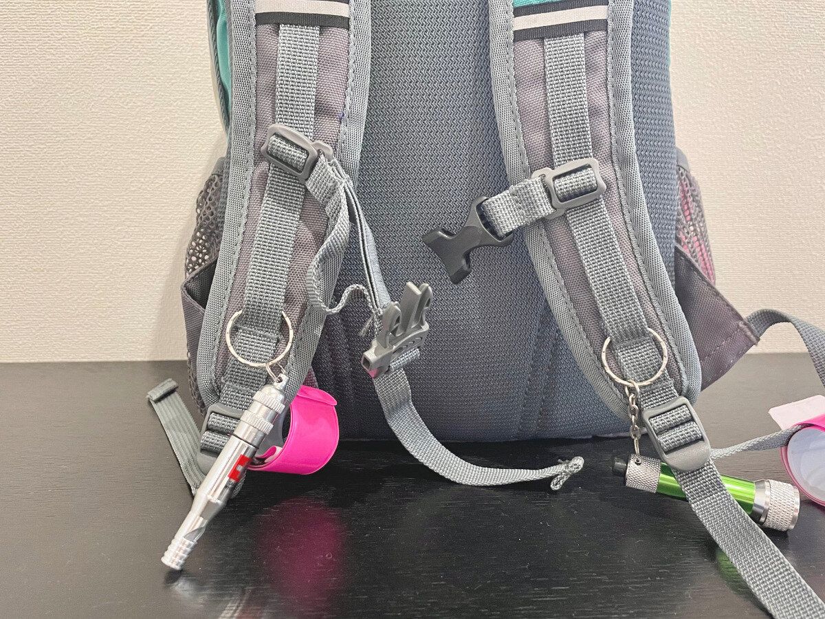 子ども用の防災リュックにも同じ「ホイッスル」をつけています。