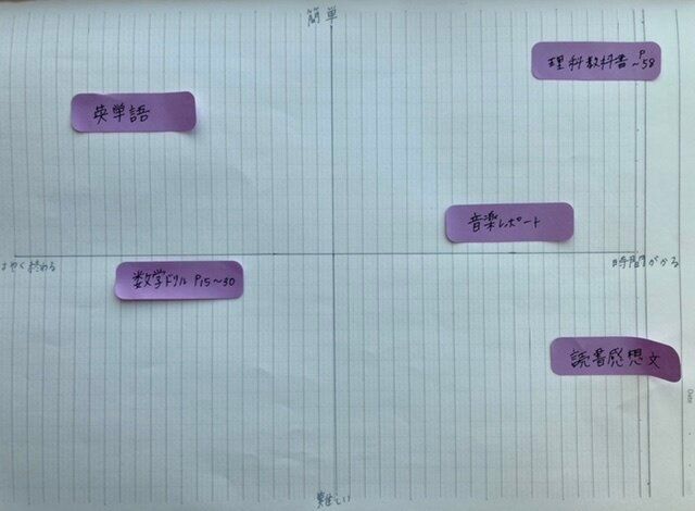 復習プリントのように1枚やればいいもの・得意科目なら、左上に。読書感想文や、苦手科目のレポートなどは右側の下の方にいくはず。