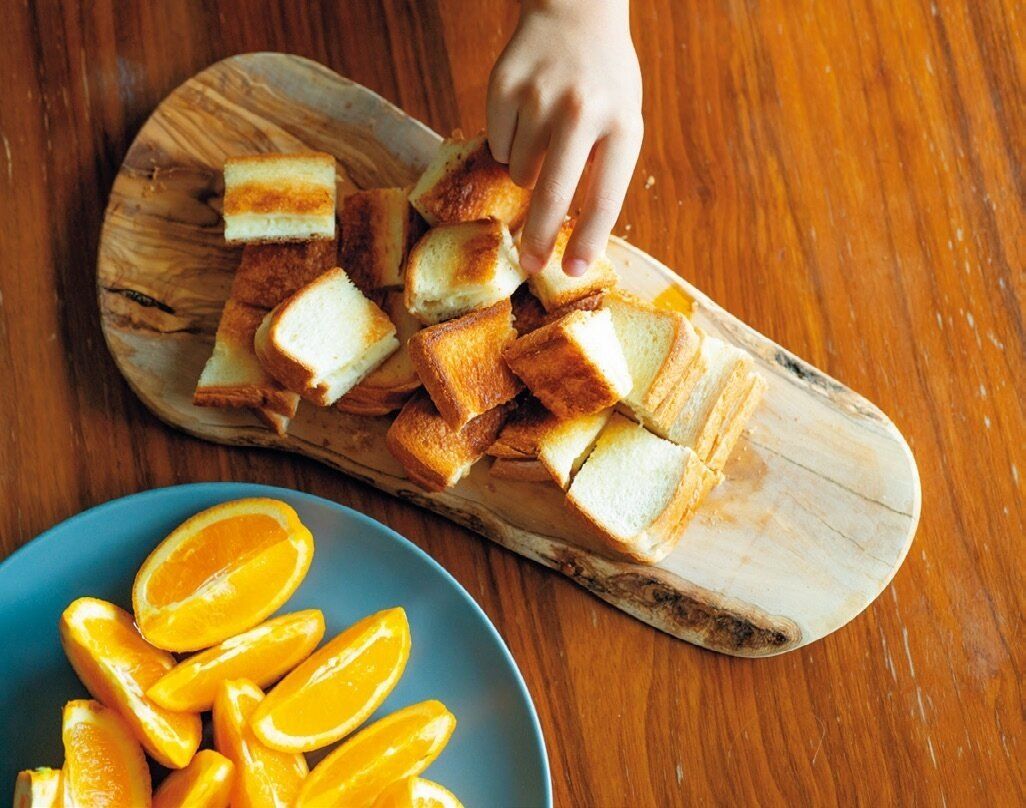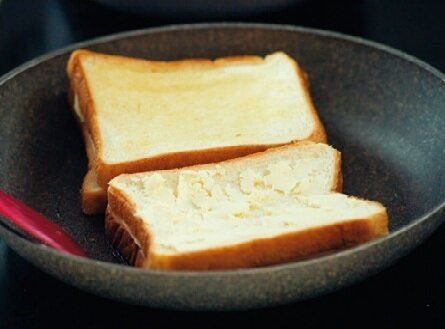 「スキンケアをゆっくりする余裕はゼロ。2枚の食パンにチーズを挟み、外面にバターをたっぷり塗ってフライパンで焼く人気メニュー。パパをアシスタントに朝ごはんだけで2斤焼く。もうすでに苦行」。