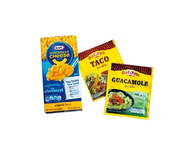 右からオールドエルパソ ガカモーレスパイスミックス(¥235)、オールドエルパソ タコシーズニングミックス(¥235)、クラフト マカロニ&チーズ チーゼストオリジナル(¥462)/カルディコーヒーファーム www.kaldi.co.jp