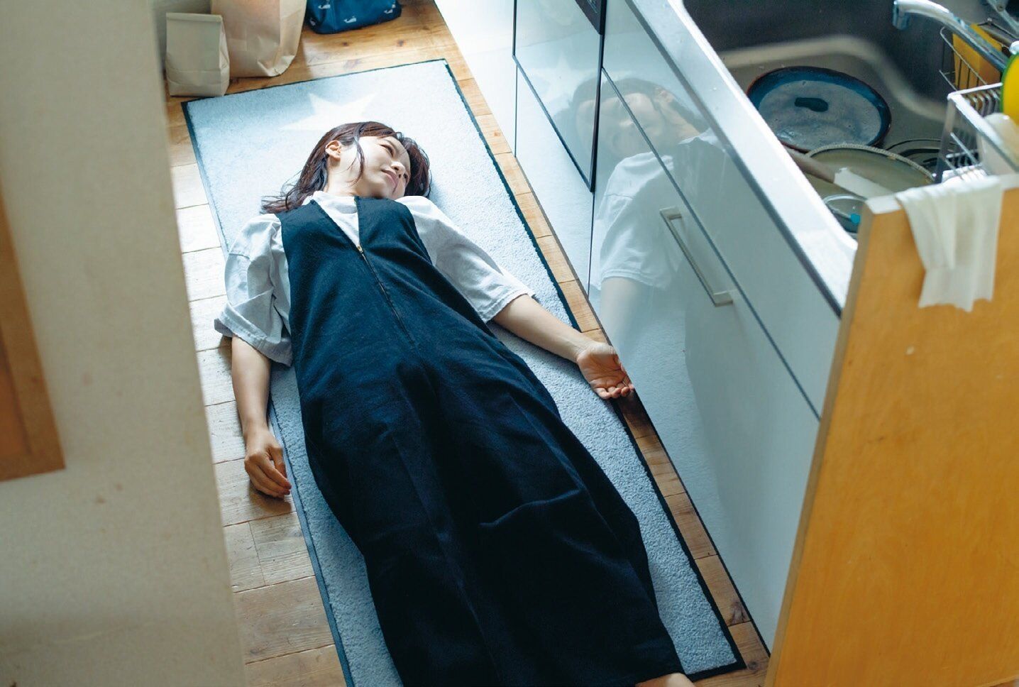 「疲れた体をキッチンマットの冷たさで癒やし、隠しておいたチョコをこっそり食べて体力チャージ。3食作るのって大変」。
