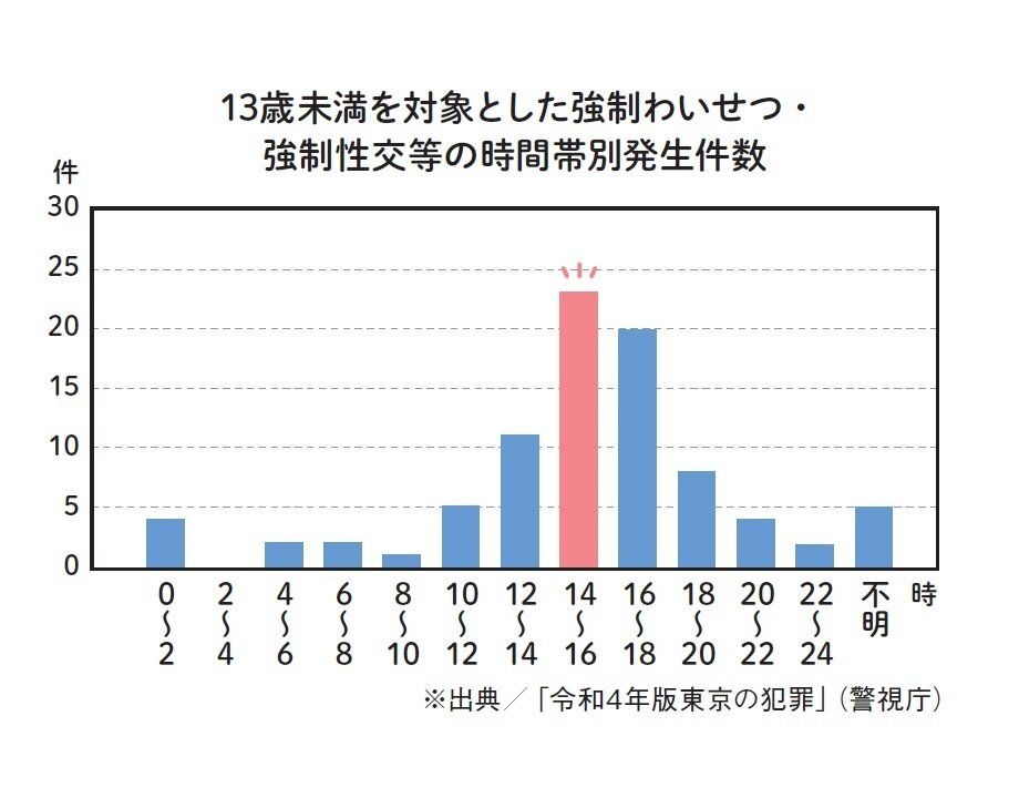 小学生の犯罪被害が多く発生している時間帯は、実は日が暮れた後ではなく、14~18時が多いことがわかっています。まだ明るいから安全ということではなく、気が緩みがちな下校時刻こそ注意が必要です!