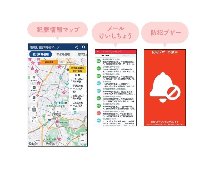 「デジポリス」は警視庁公式の無料防犯アプリ。都内の犯罪発生情報が地図上に表示されたり、犯罪発生情報や防犯情報を知らせてくれます。アプリ内に防犯ブザーや痴漢撃退の機能も。