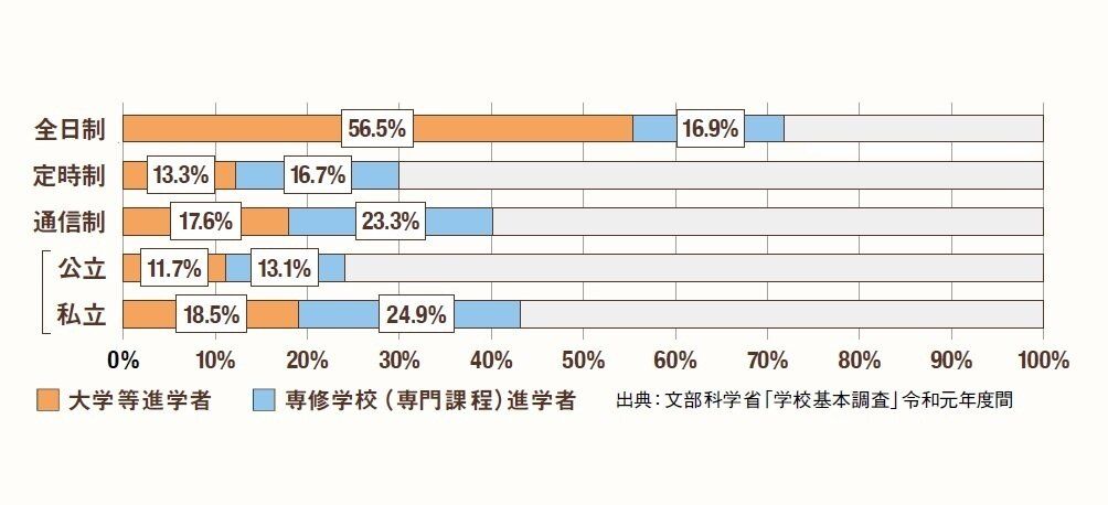 大学等への進学が約18%、専門学校への進学が約23%。私立の通信制高校に限ると、4割以上が大学や専門学校に進学している。