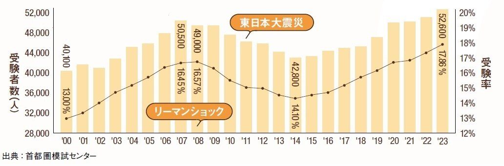 リーマンショックで一時期落ち込んだ受験者数も近年は毎年増加。今年は6年生人口の減少で受験者数は減る可能性があるものの、受験率は横ばいとなりそうです。