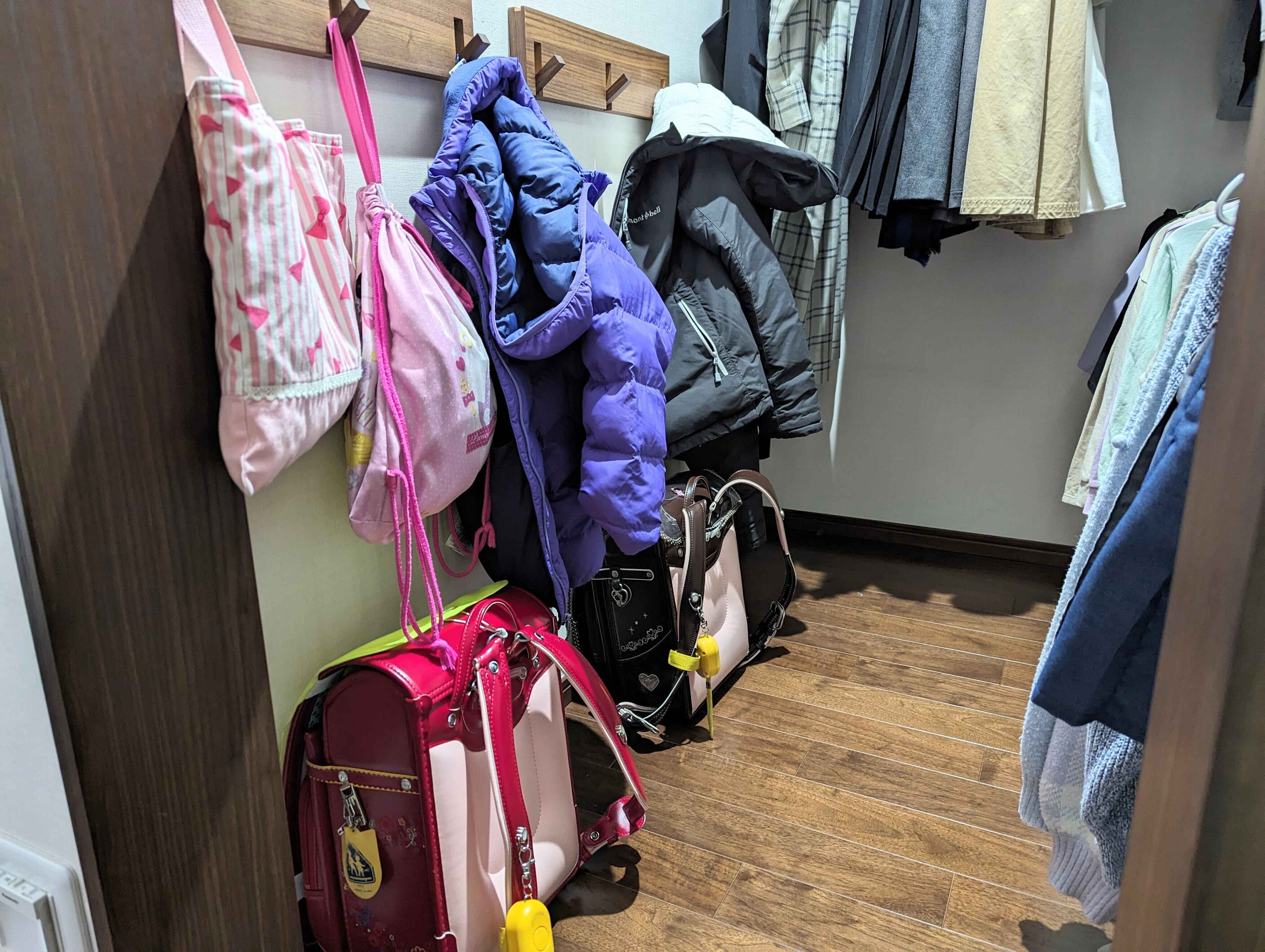 いろいろ試した結果、今はリビング横にあるファミリークローゼット内に直置きするスタイルに。持ち上げたり引っかけたりせず、ただ床に置くだけだから、1年生でも大丈夫。