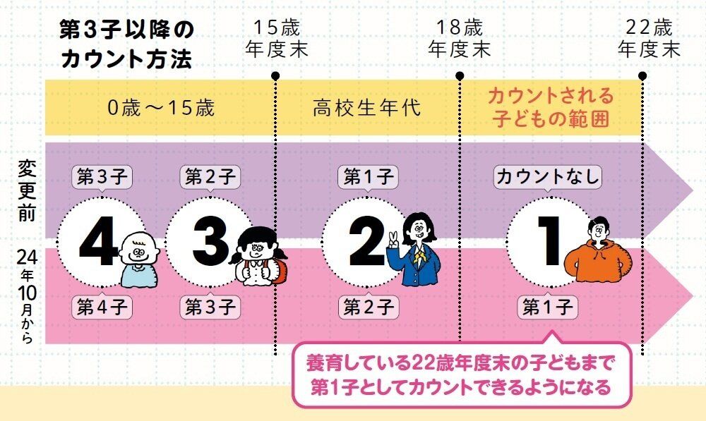 【注意】「第3子以降のカウント方法」が変更され、対象が18歳年度末→22歳年度末まで延長される