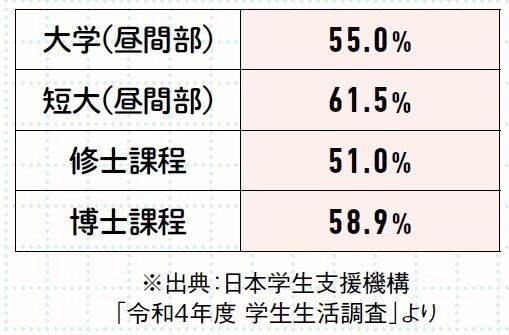 ●今や2人に1人が借りる時代!奨学金を受給している学生の割合