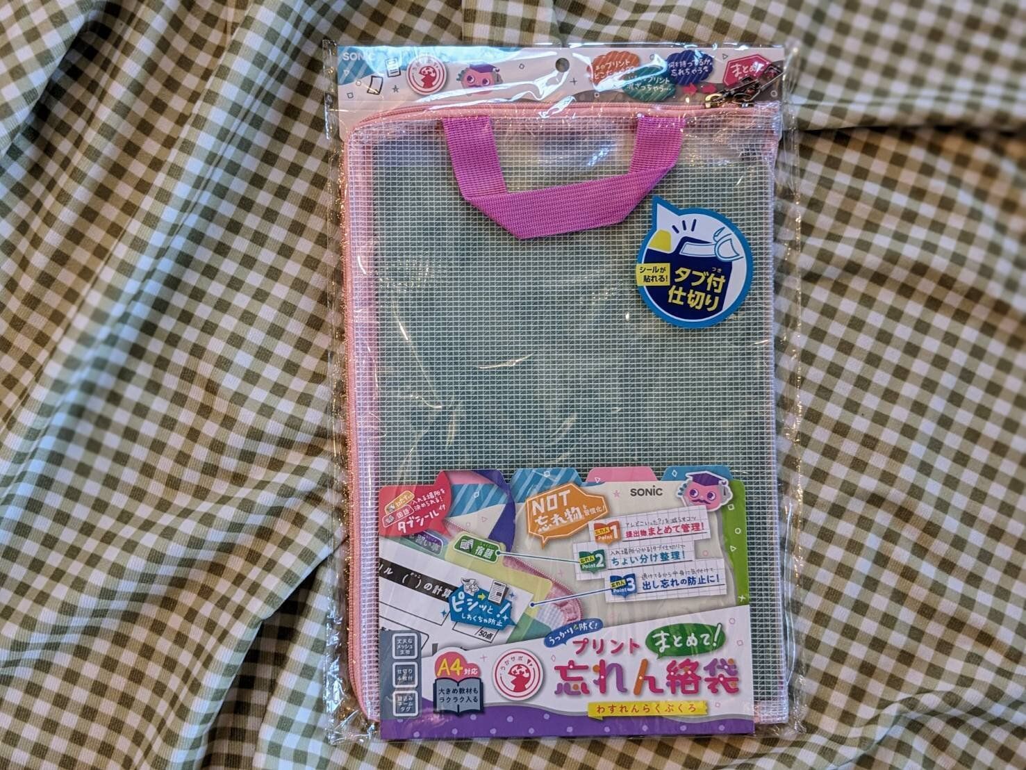 1、2年生の間は学校から支給された連絡袋を使っていた長女ですが、ボロボロになってきたのもあって、新しく用意したのが『忘れん絡袋』です。
