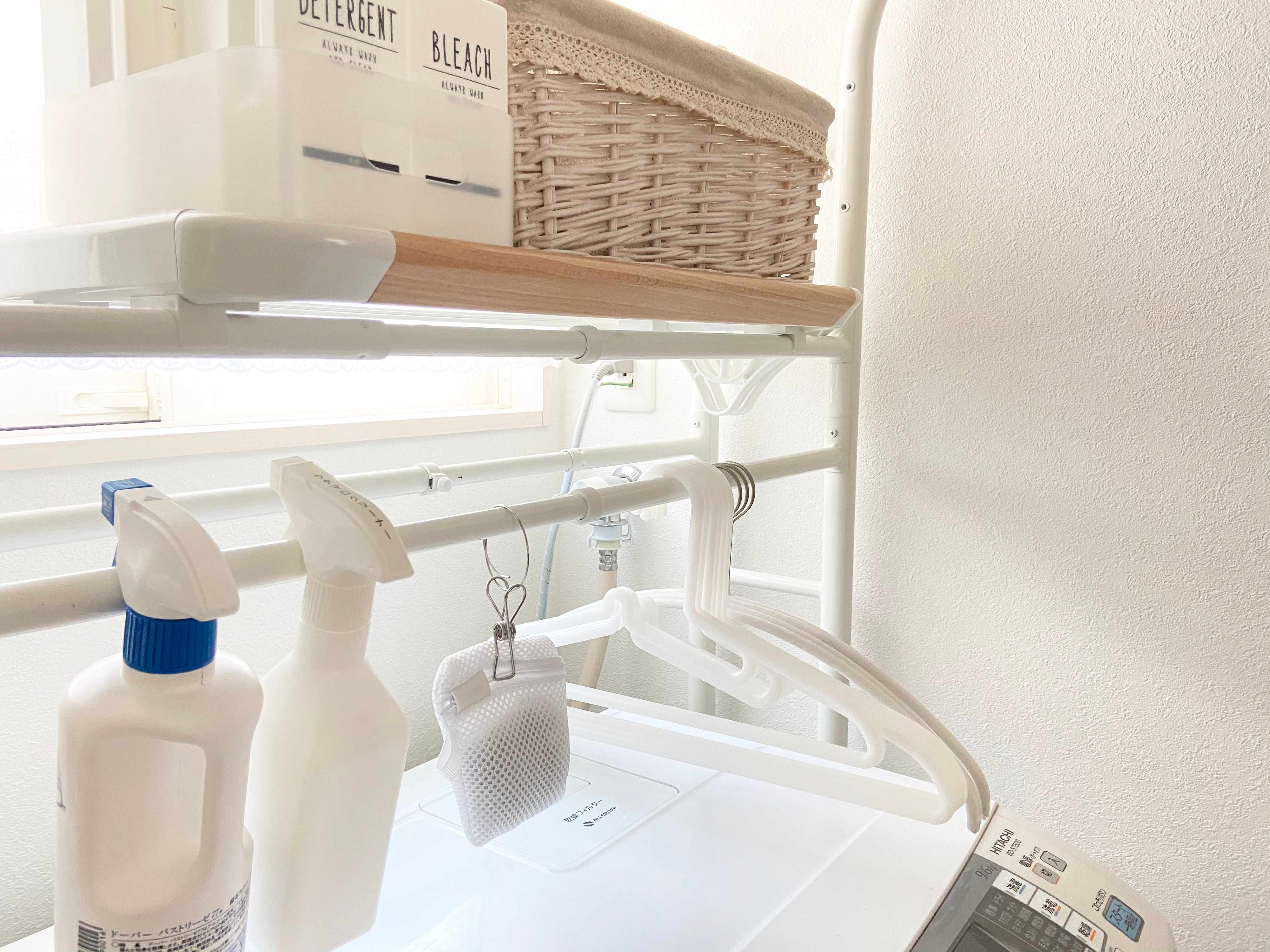 動線をシンプルにするために、洗濯に使うものは全て洗濯機の上の棒と棚に集結させています。洗濯が終わったら、扉を開けて取り出す→その場でハンガーをかける→ラックに一時置きする→和室(平日)or1階ベランダ(休日)にまとめて運ぶに。ぎっくり腰になった時に、極力動きを最低限にしようとした結果今のカタチに行きつきました。
