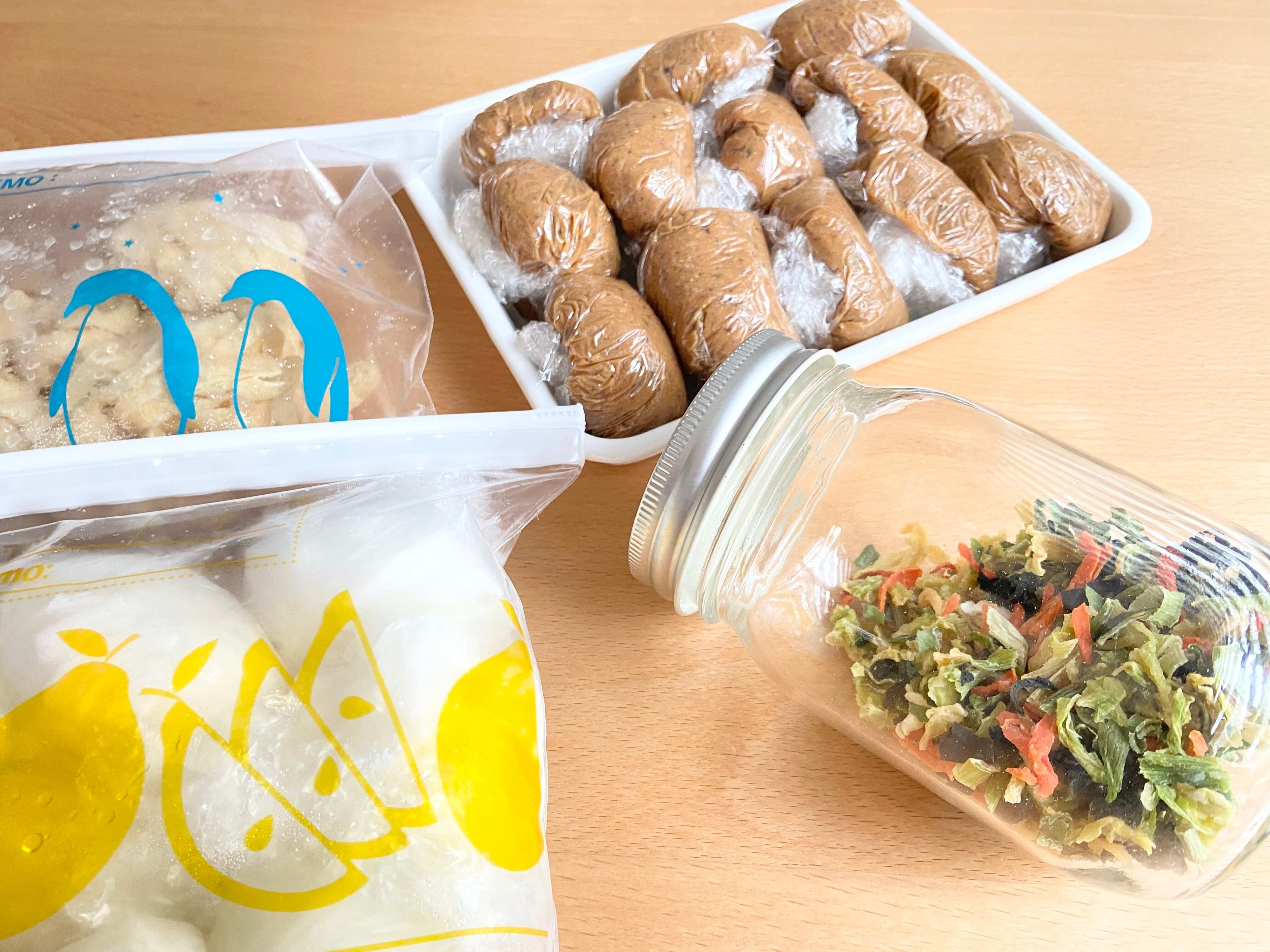 汁物も夕飯メニューに必ずある1品。その中でもやっぱり頻度が高いのがお味噌汁。出汁パックで出汁を取って、味噌を適量入れて溶かして、味噌汁の中に入れる具材まで準備するというのが本当に面倒に思いながら作っていたんです。そんな私がたどり着いたのが、味噌玉作りと刻み具材の冷凍。
