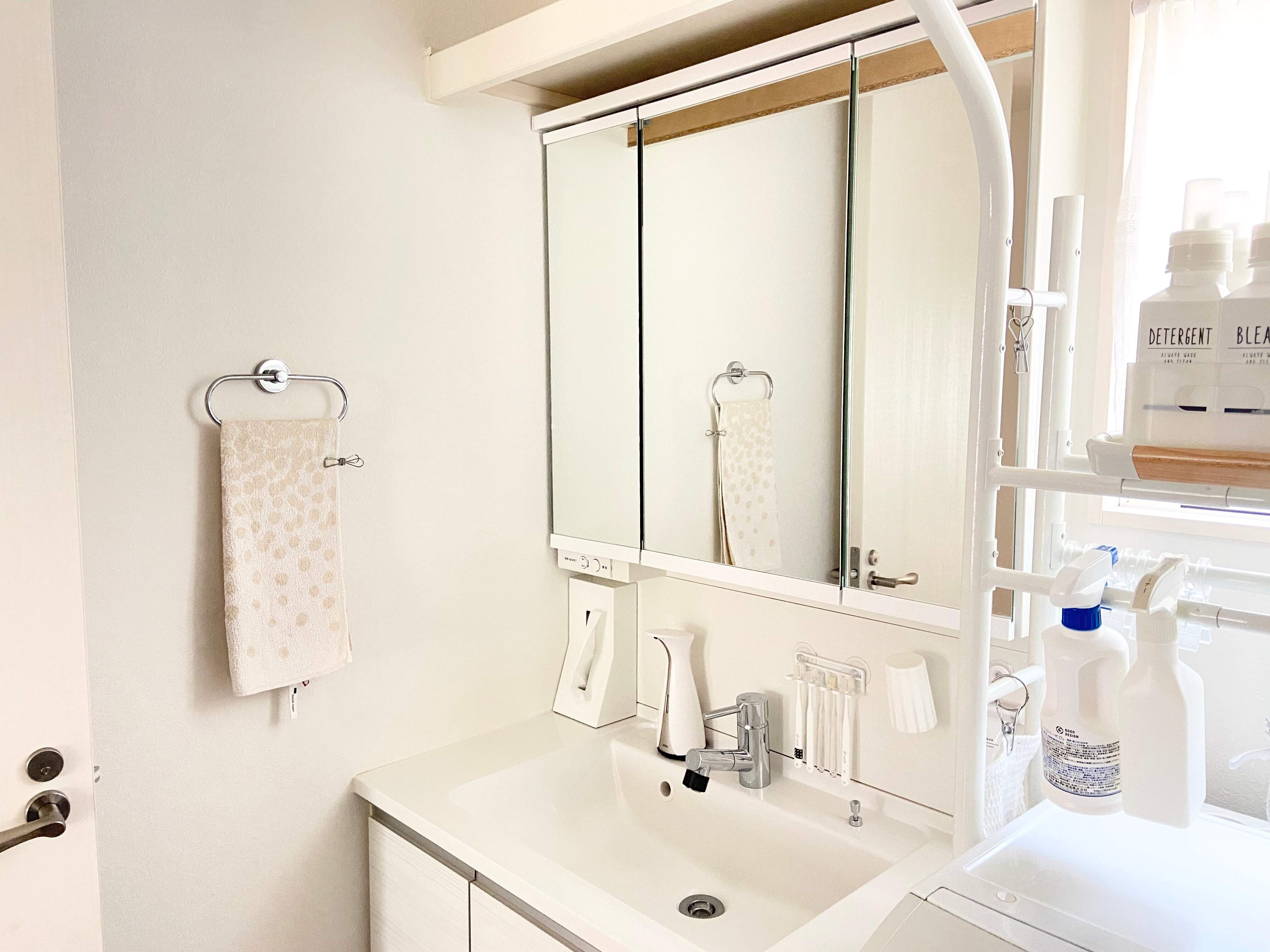 洗面所は意外にもモノが溢れやすい場所なので、スペースを取りやすいバスタオルをやめてビッグフェイスタオルに替え、また毎日洗うので洗い替えのタオルを持つのをやめました。キッチンと同様に排水口の掃除にすぐ取りかかれるよう蓋を取り外してパンチングごみ受けに入れ替えました。ごみ箱を置くと回収が手間なので、ごみ箱は置かず、都度キッチンのごみ箱に持っていくことにしています。
