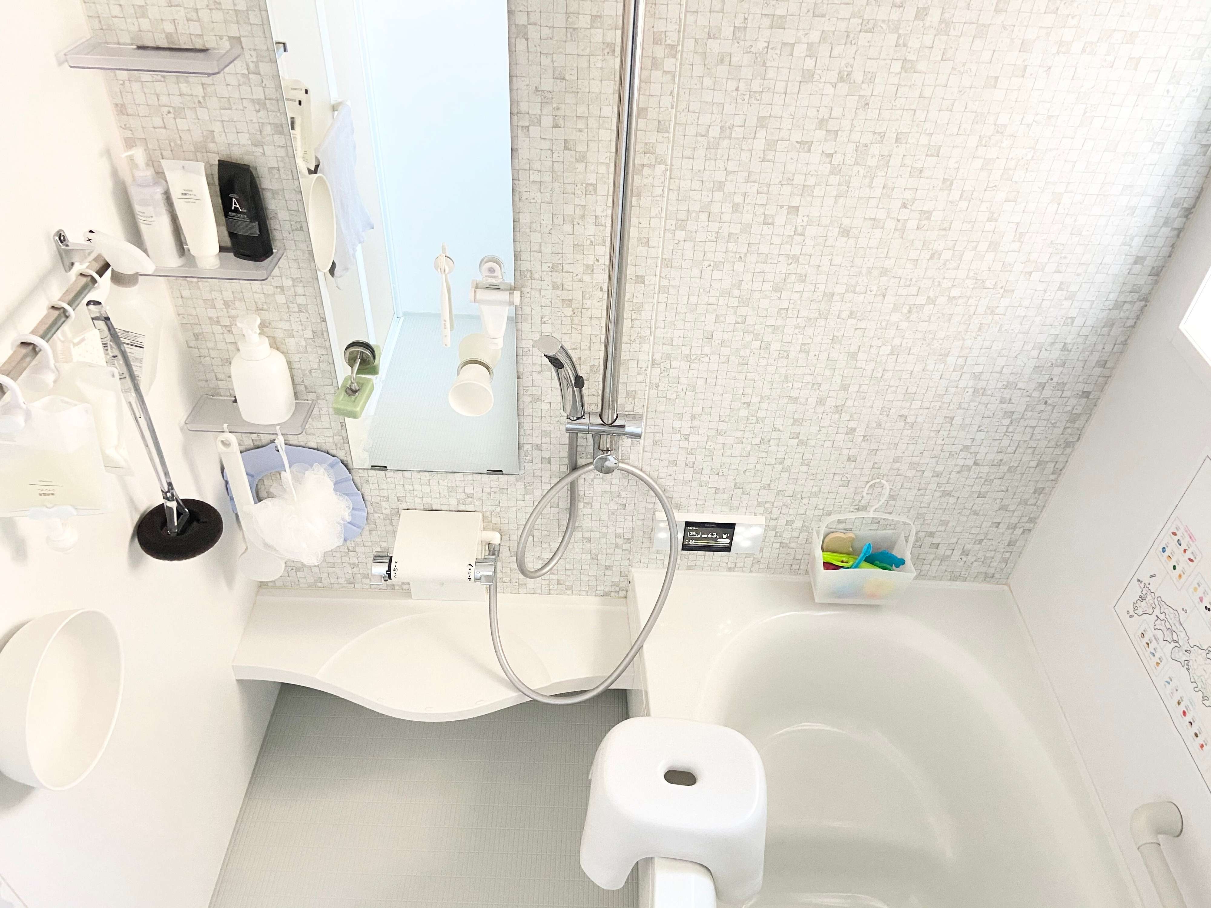 お風呂場の掃除を楽にするために、基本何でも浮かせることにしています。そのため手放したのが床置きのラック。そして、ボトルの詰め替えとボトルの汚れ掃除が手間だったので詰め替えパックがそのまま使える詰め替えそのままミニを使い、詰め替えボトルを手放しました。