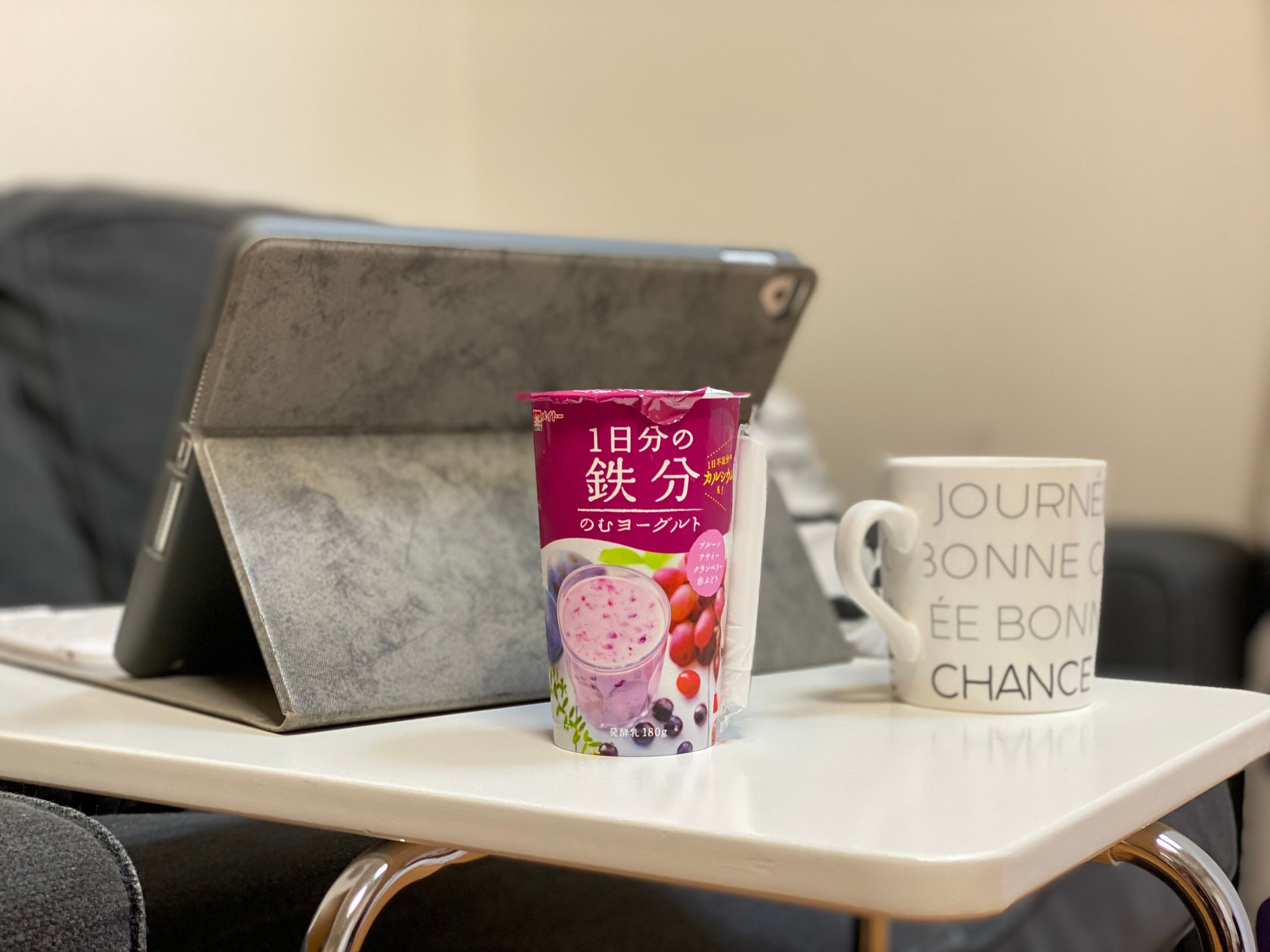 この日のお供は「1日分の鉄分のむヨーグルト」。これ1本で不足しがちな鉄分とカルシウムを手軽に取れるので、気に入ってます。
