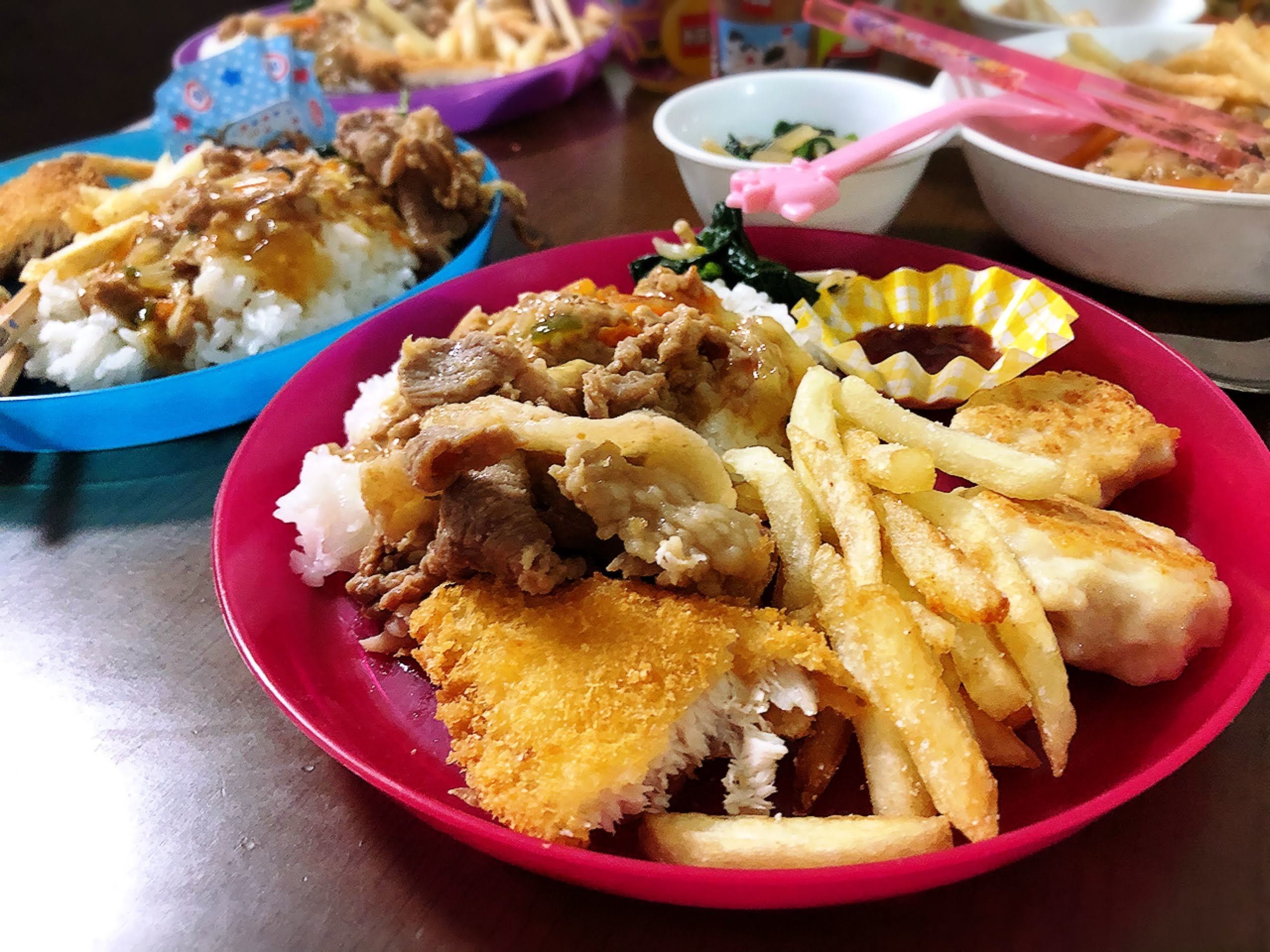 前回はね、お肉にお魚のフライにチキンナゲット・野菜のサラダ・ポテトフライ・あんかけごはん・・・とっても豪華なプレートになりました!!