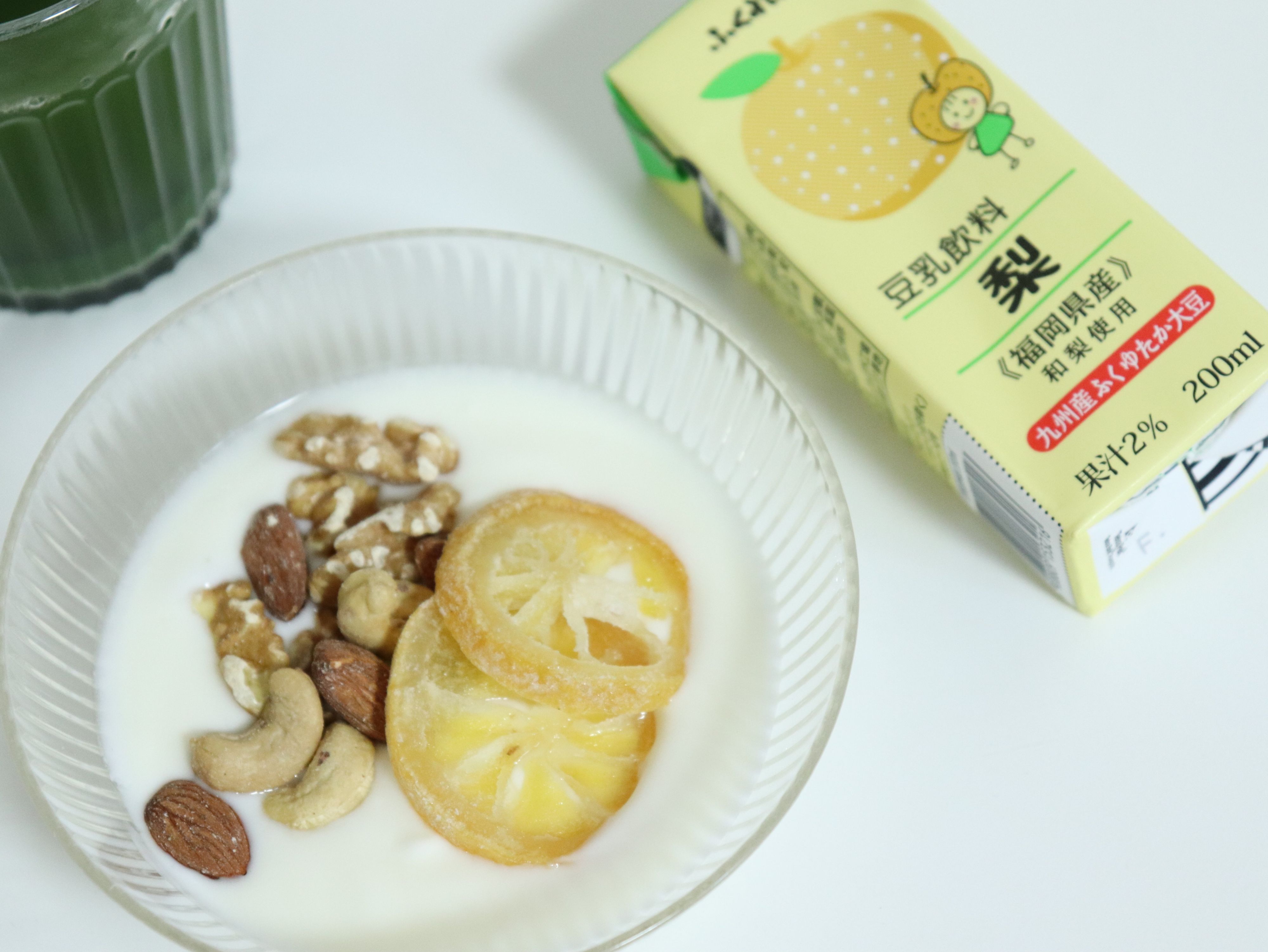 たっぷりナッツと、さっぱりとしたレモンのドライフルーツを添えたヨーグルト。お湯で割った青汁。ふくれん 豆乳飲料 梨。
