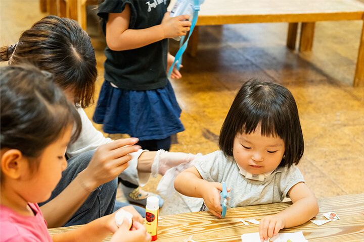 身体的サポートが必要な子や発達がゆっくりな子にはそれぞれに合ったサポートが必要です。うーたん保育園には、児童発達支援センターが併設されていて、支援センターには言語聴覚士や理学療法士、臨床心理士など専門職がおり、保育園を定期に訪問しています。保育士と連携しながらこどもたちをサポートしています。