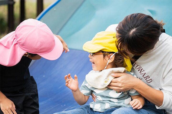 理学療法士はこどもと遊びながら、身体の状態を確認します。膝まわりの筋力が弱いと判断したら、膝の筋力を使うような遊びを保育士に提案。車いすを使っている子の関節の可動域が気になれば、同じ姿勢を取りすぎないようアドバイスしています。