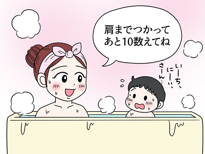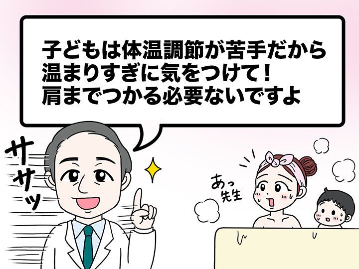 「肩までつかって100まで数えて…」というのは、寒い時期の入浴でありがちな光景ですが、実はその必要はありません。子どもは体が小さく体温調節が苦手なので、大人より温まりやすいという特徴があります。熱すぎる温度や長すぎるお風呂は、逆に子どもの体に負担をかけてしまうんです。